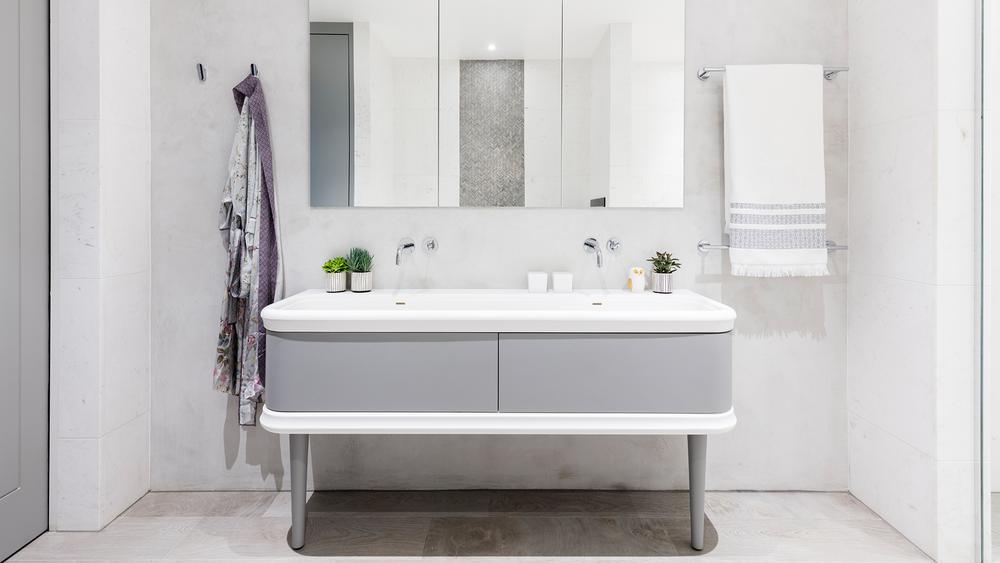The two main emphasis points, the basin area and the bath, are the finest places to use rounded shapes for maximum impact. Curved accessories, such as tables and mirrors, can soften the design if that isn't an option.